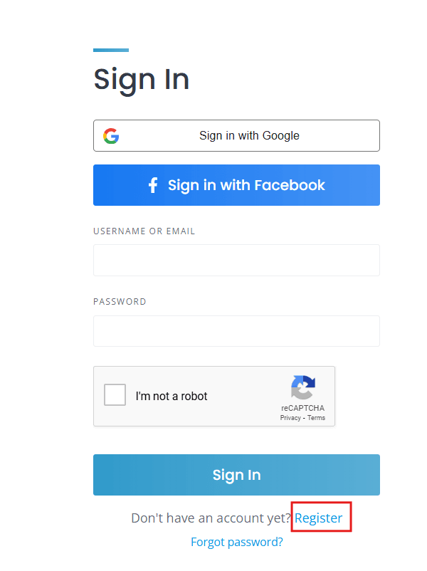 In the “Sign In” page click on the “Register” link near the “Sign In” button highlighted with a red box in the image below