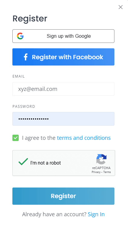 If you are using Google or Facebook login then this form will appear right after you click on “Register” button